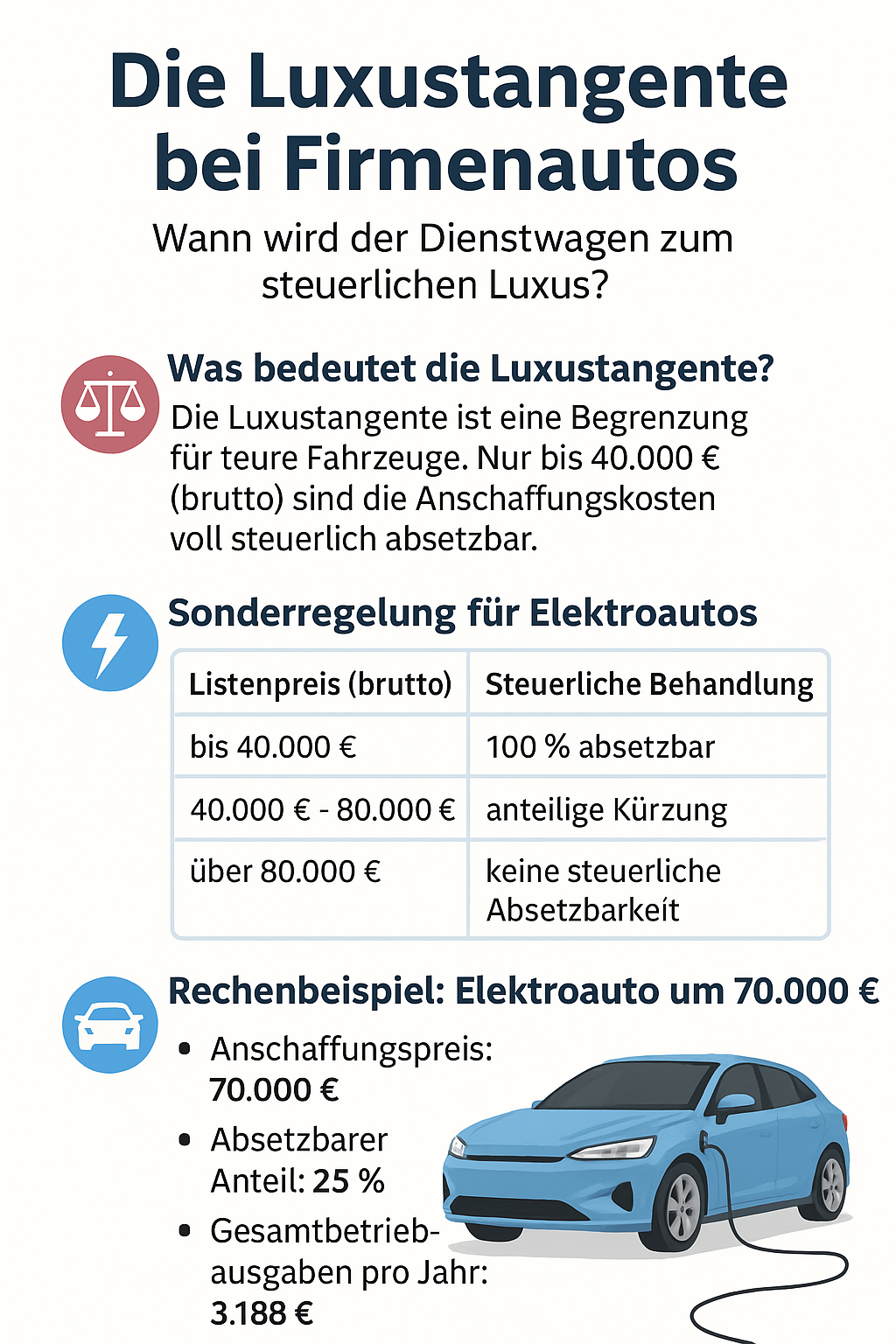 - Reine Elektroautos → deutlich bessere steuerliche Behandlung (bis 80.000 €).