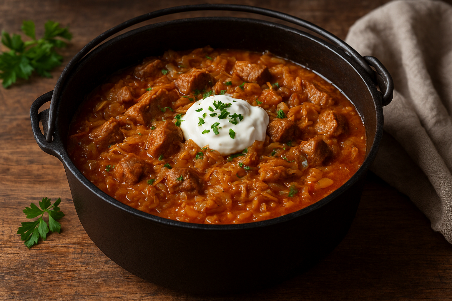 Hier ist ein wunderbar rustikales Szegediner Gulasch, das im Dutch Oven perfekt gelingt – langsam geschmort, mit zartem Fleisch, Sauerkraut und cremigem Schmand.