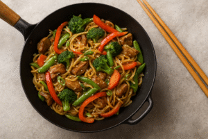 - Teriyaki-Wok mit Udon-Nudeln – japanisch inspiriert mit Gemüse und Sesam.